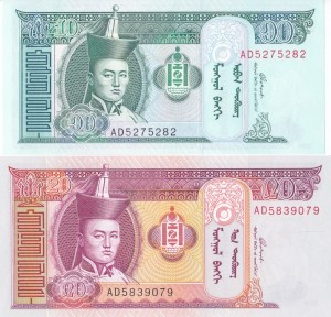 Bancnota Mongolia 10 Si 20 Tugrik 2005 P62c 63c Unc Set X2
