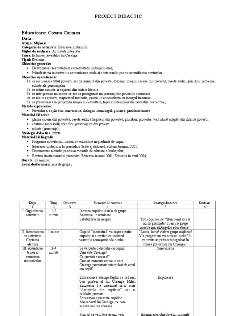 Proiect Didactic In Lumea Povestilor Lui Creanga1