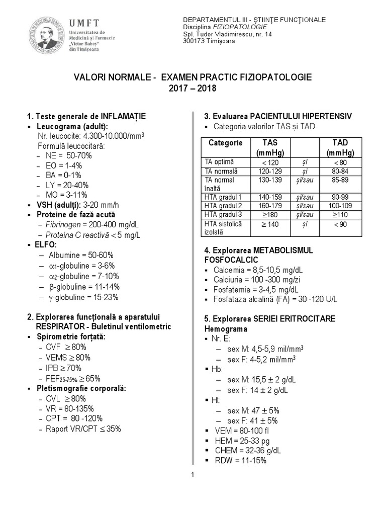 Valori Normale Examen Practic Fiziopatologie 2017 2018
