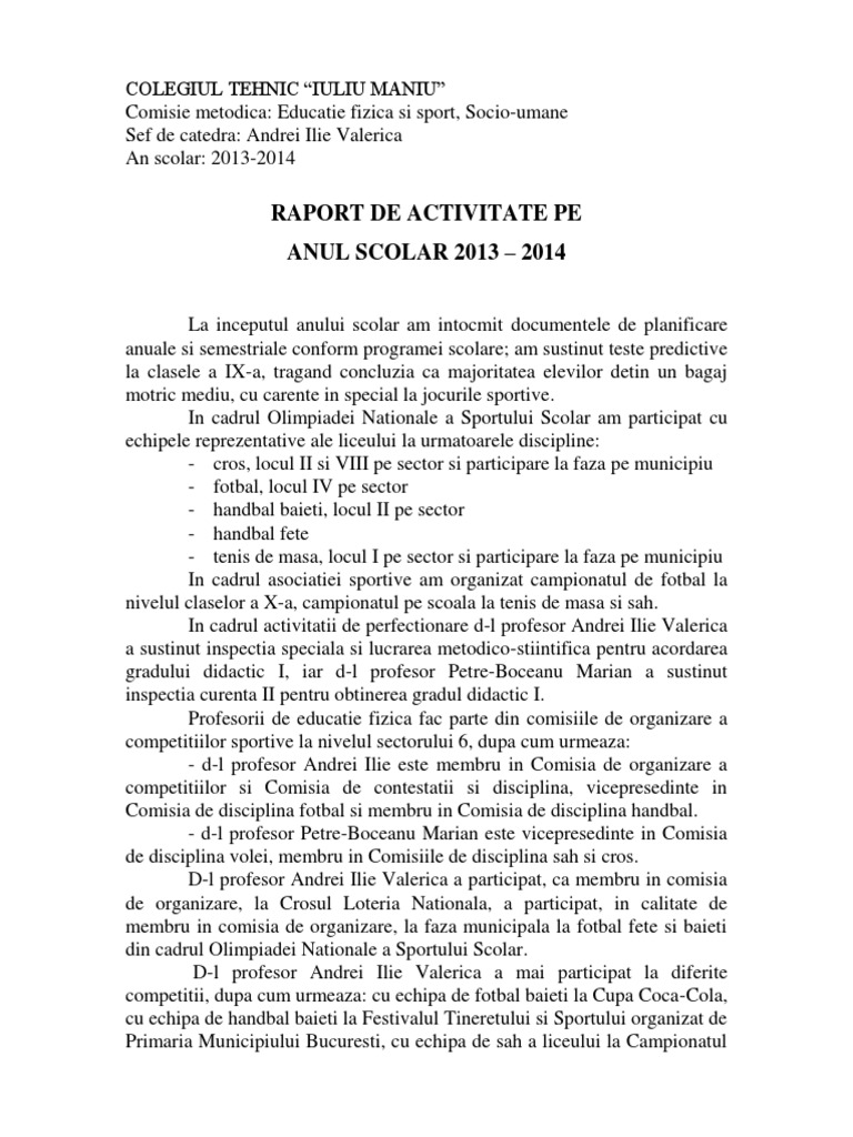 Raport De Activitate Educatie Fizica Pdf Colegiul Nae Ional