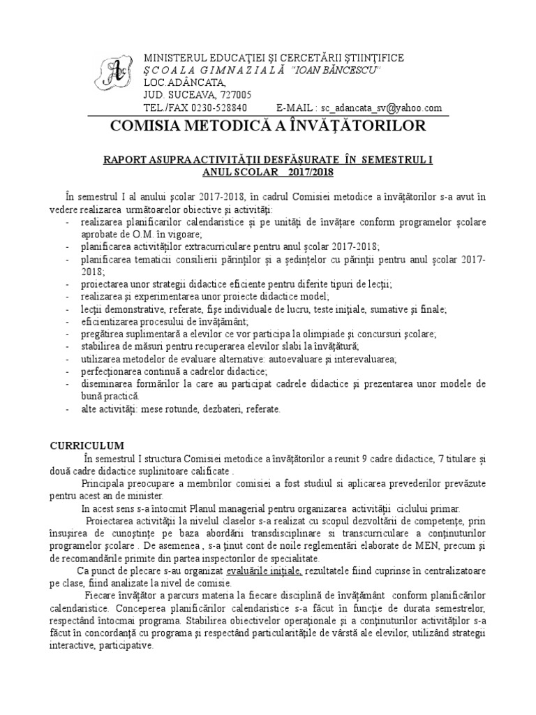 Raport De Activitate Pe Sem I Invatatori