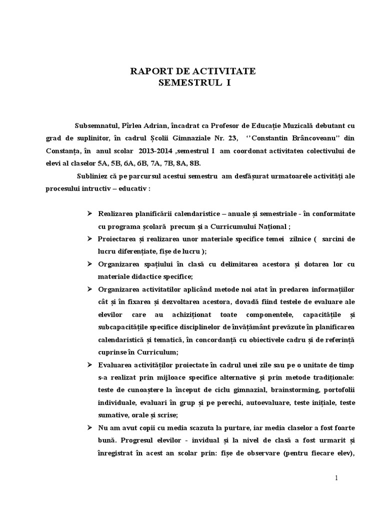 Raport De Activitate Profesor Educatie Muzicala