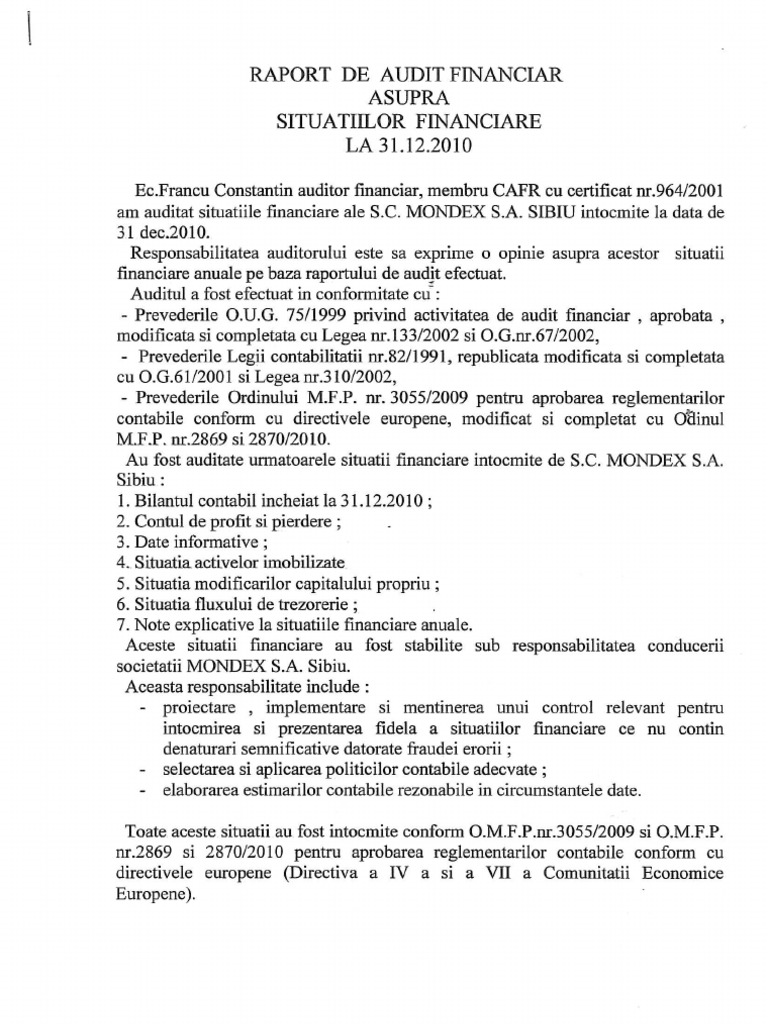 Auditul Financiar Raport De Audit Financiar