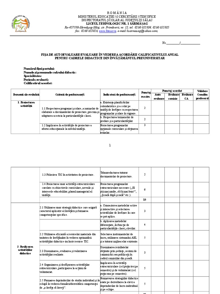 Fisa De Autoevaluare Evaluare In Vederea Acordarii Calificativului