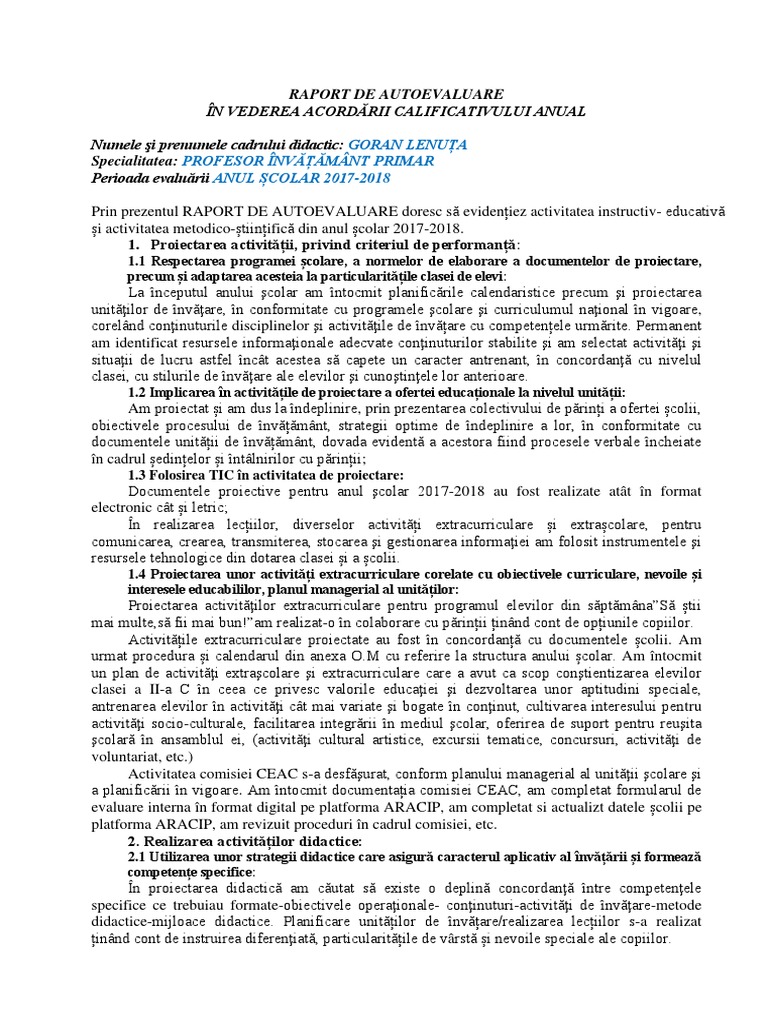 Raport De Autoevaluare Pentru Conferirea Gradului Doi By Diana