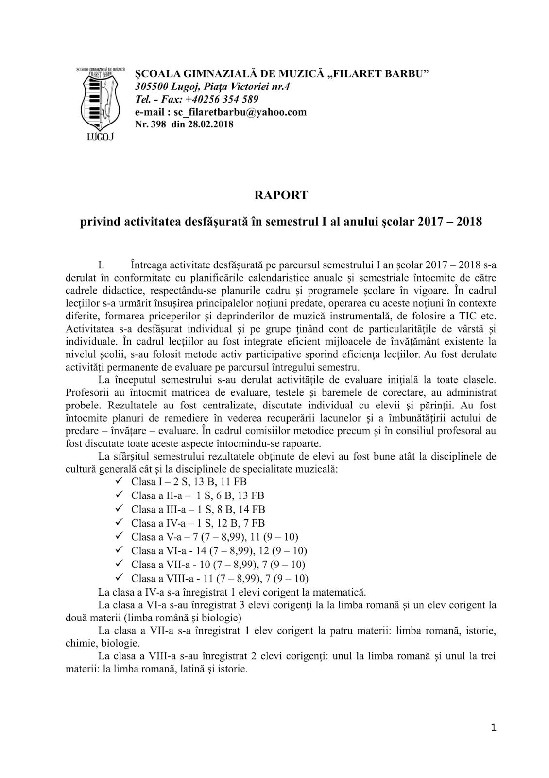 școala Gimnazială De Muzică Filaret Barbu Lugoj Raport De