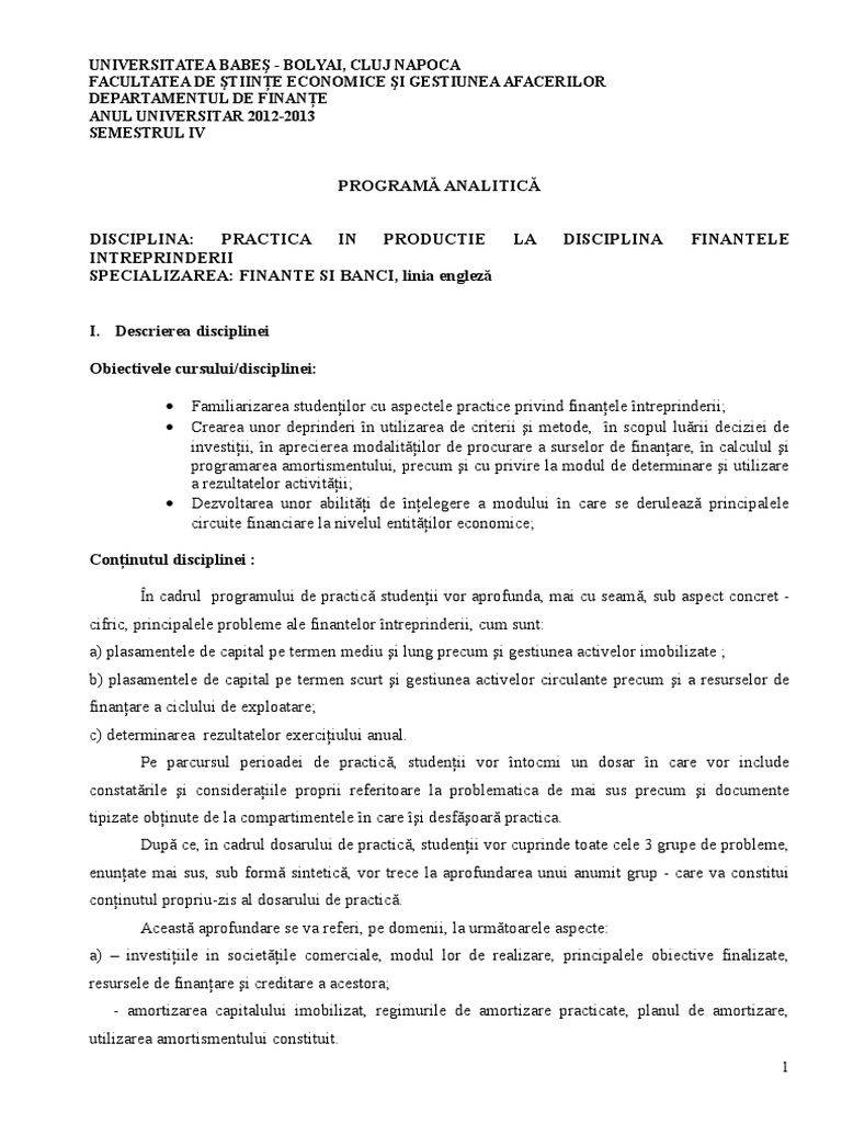 Programa Analitica Practica Finantele Intreprinderii Linia Engleza