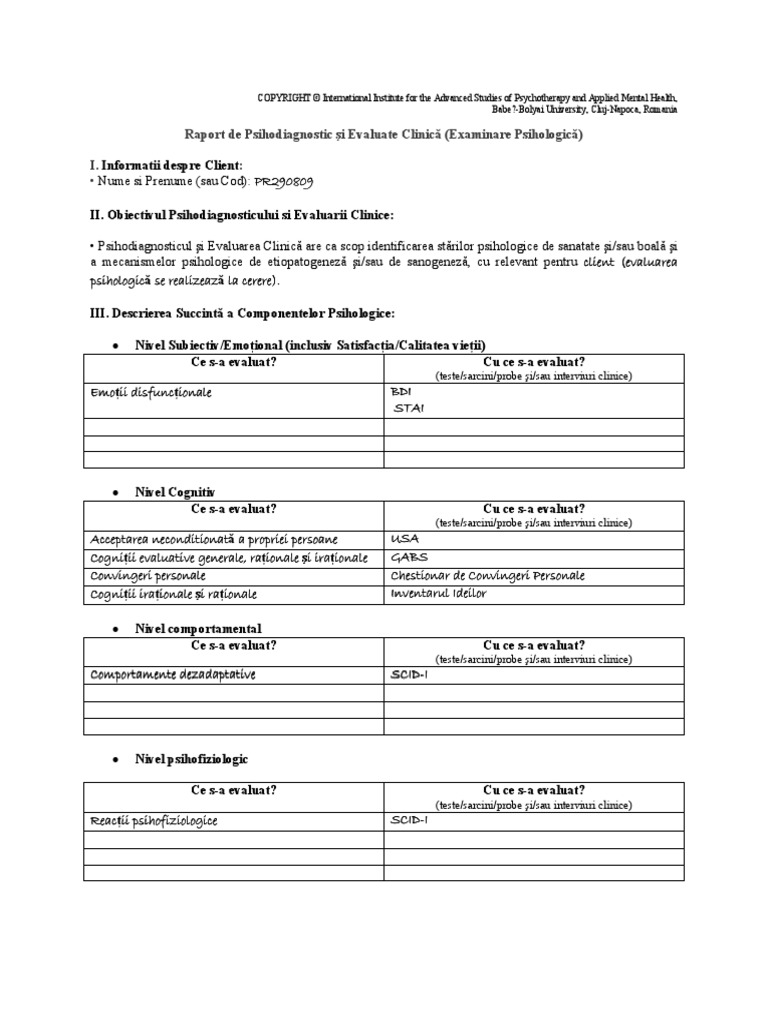 Raport De Psihodiagnostic Si Evaluare Clinica Word