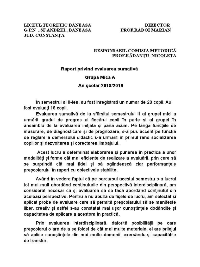 Raport Evaluare Finala Grupa Mica Ionela 2019