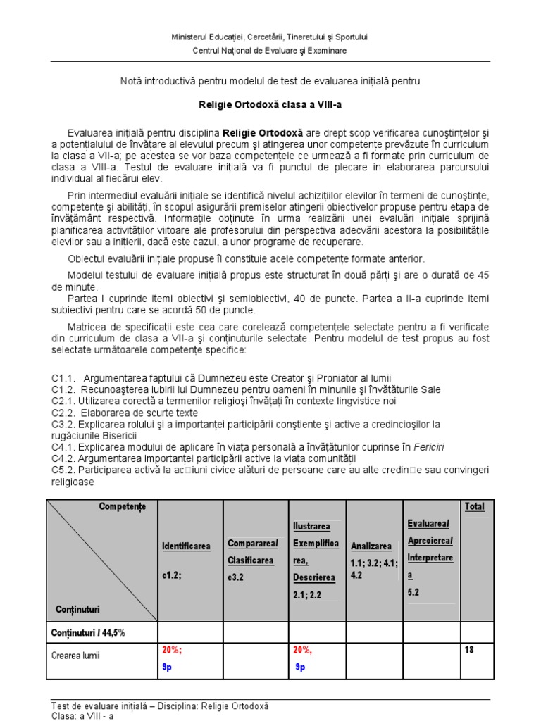 Evalurea Initiala Religie