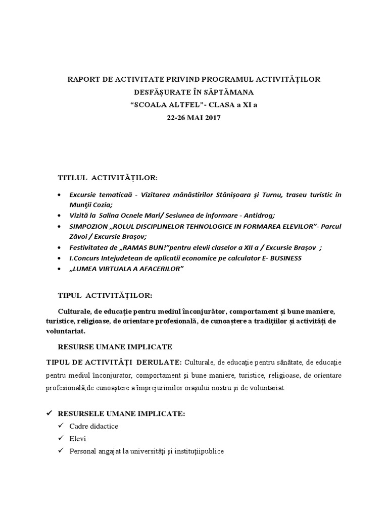 Raport școala Altfel An școlar 2017 2018 școala Gimnazială