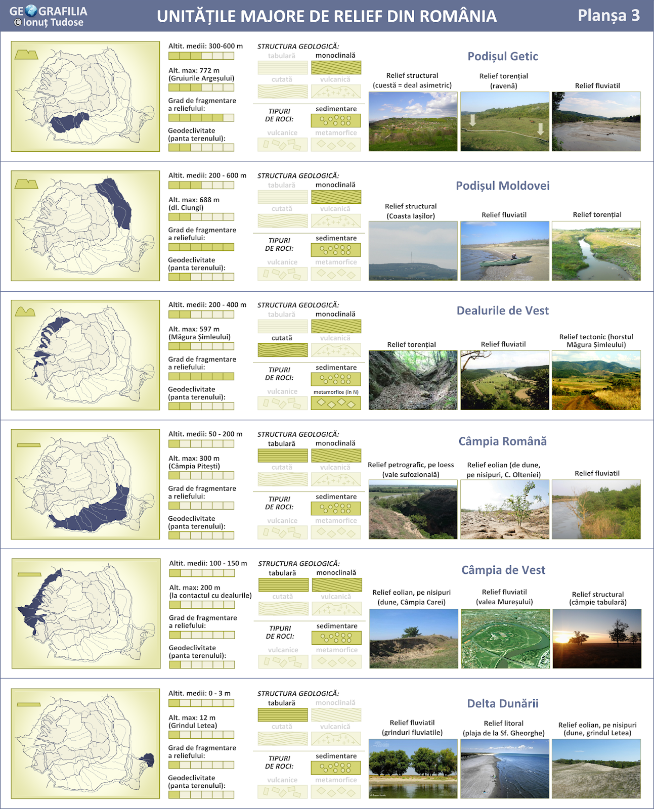 Unitati de relief tabele utile pentru bacalaureat. Joc pentru învățarea subunităților de relief din românia. Prezinta un relief tipic de podis situat la v de valea siretului altitudinile medii sunt de 450 500 m altitudinea maxima 688 m in dealul ciungi din podisul dragomirnei relieful este alcatuit dintr o succesiune de regiuni joase si de culmi deluroase inclinate pe directie se sau s ca forme de relief predomina cuestele. Relieful româniei se caracterizează printr o mare diversitate și complexitate.